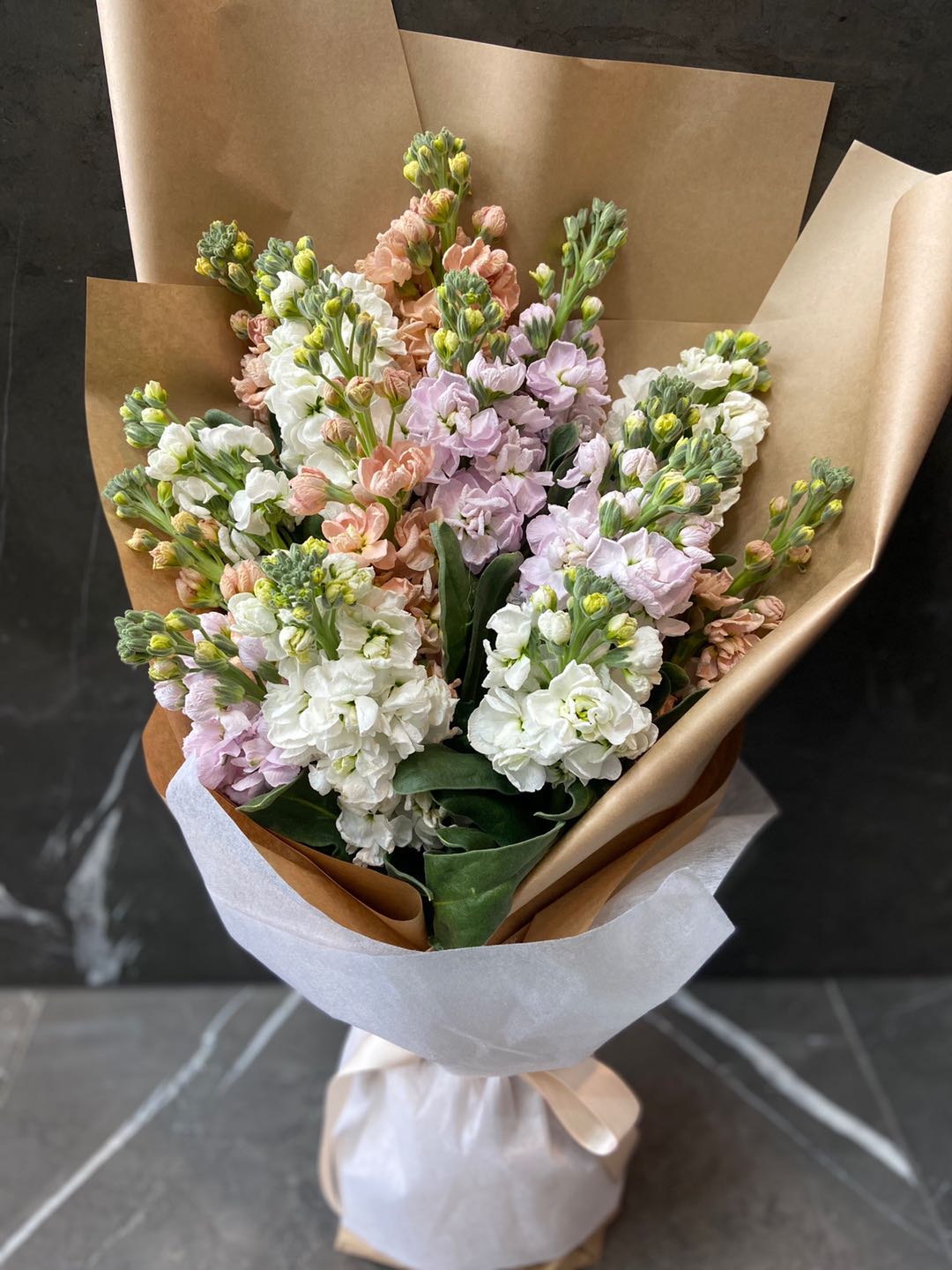 A bunch of mixed colours of stock flowers. They have beautiful scent which will fill up the space. Colous may vary depending on availability.